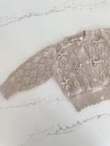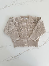 This Knit Bow Cardigan is designed with delicate bow appliques and charming front buttons, perfect for your baby girl. The hollow-out knit pattern adds breathability and a soft texture, ensuring comfort while keeping her stylish and cozy. Ideal for layering, this cardigan offers gentle warmth and a sweet look that supports your little one’s comfort throughout the day.