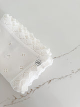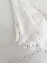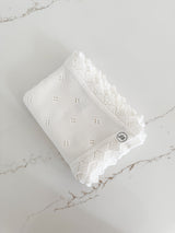 Wrap your little one in this charming soft and cozy knit blanket with stunning hollow out pattern and scalloped trim all around. Not only is this blanket perfect for all your outings, but will also add charm and uniqueness to any outfit. Pair this capsule piece with our ribbed knitted jumpsuit or romper to create an irresistible outfit.