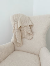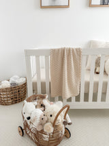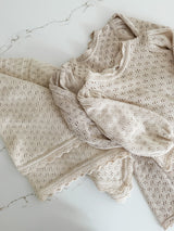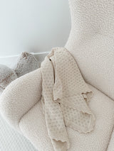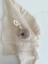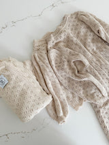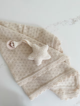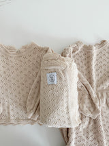 Wrap your little one in this charming soft and cozy knit blanket with stunning hollow out pattern and scalloped trim all around. Not only is this blanket perfect for all your outings, but will also add charm and uniqueness to any outfit. Pair this capsule piece with our hollow out top, dress and jumpsuit to create an irresistible outfit.