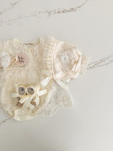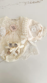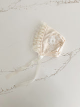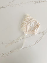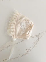 Elevate your little one's style with our luxurious Lace Bonnet. Made from soft satin fabric with delicate floral applique and silk ties for an elegant touch. Perfect for special occasions or everyday wear, this bonnet adds a touch of sophistication to any outfit. Your baby will feel like a little princess!