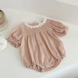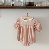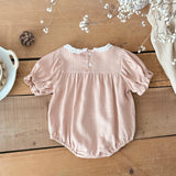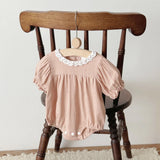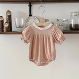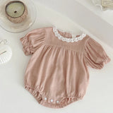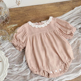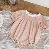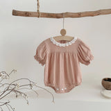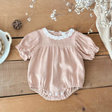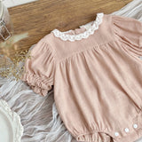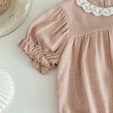 This Blush Linen Romper features delicate lace trim and short sleeves, offering a light and airy feel perfect for warm days. Its breathable fabric ensures comfort while keeping your little one stylish and cool. Ideal for everyday wear or special occasions, this romper combines softness with charming details for a gentle, supportive fit.