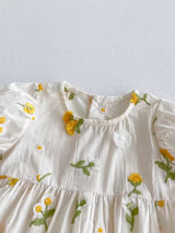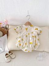 Short sleeve romper with floral appliqué all over.