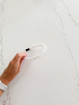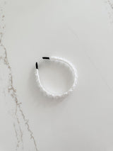 Stretchy headband with cotton fabric that ties into a bow. Approximately 6in long and best suitable for babies from 0-2y.