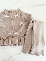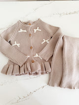 Knit cardigan with front buttons and bow appliqué all over. Matching knit pants with elastic waistband and flare.