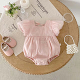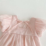 The Marie Embroidered Romper combines delicate organza overlay with a charming square neckline and embroidered flower applique, creating a sweet look for your baby girl. Short sleeves and back ties ensure a comfortable fit while adding a touch of elegance to her outfit.