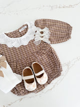 Introduce your little one to timeless charm with this delightful gingham romper. Crafted from soft, breathable cotton, it's gentle against delicate skin and perfect for all-day wear. The long sleeves provide cozy coverage, while the sweet lace collar adds an elegant touch that makes every moment feel special.