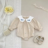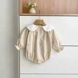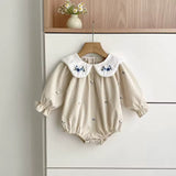 The Enid Embroidered Romper features charming floral embroidery and a beautifully detailed embroidered collar, combining style with softness. Made from gentle fabric, its long sleeves keep your baby cozy and comfortable throughout the day. This romper is an ideal choice to dress your little one in effortless elegance and warmth.