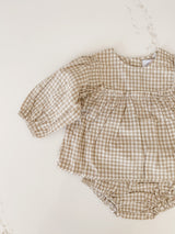 Indulge in luxury with our Gingham Cotton Set. This 2 piece set features gingham pattern all over, paired with long sleeves for a touch of elegance. Complete the look with the matching bloomers, perfect for your little one. Elevate your baby's wardrobe with this exclusive set.