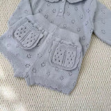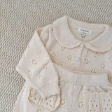 Elevate your little one's wardrobe with this charming Hollow Out Knit Set, designed for both style and comfort. The long sleeve cardigan features delicate button-up closure and an eye-catching hollow out pattern accented with scalloped trim for an elegant touch. Pair it effortlessly with the coordinating bottoms, complete with practical pocket appliqué details.