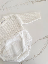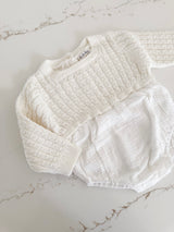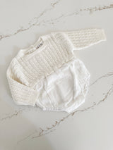 Keep your baby girl cozy and stylish in this Textured Knit Romper. Featuring a charming cable knit pattern, this long-sleeve romper adds warmth and softness perfect for cooler days. Designed to provide comfort and ease of movement, it’s an ideal outfit for everyday wear or special occasions. Its classic texture and gentle fabric ensure your little one stays snug while looking adorable.