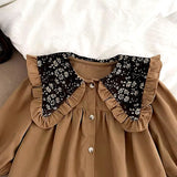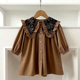 The Sadie Button Dress features a charming long sleeve design with a delicate front buttons. The overlay ruffle collar with floral pattern adds a touch of femininity to this dress, making it perfect for your little girl. Stay stylish and on-trend with this must-have dress.