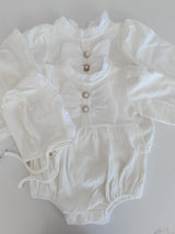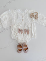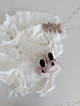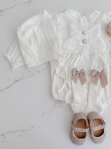 Indulge your little one in luxury with our Cotton Bow Romper and Matching Bonnet. Crafted from soft, ribbed cotton, this romper features a delicate bow appliqué and elegant pearl buttons. Complete the look with the matching bonnet, making them the most stylish baby in the room.