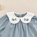 The Enid Embroidered Romper features charming floral embroidery and a beautifully detailed embroidered collar, combining style with softness. Made from gentle fabric, its long sleeves keep your baby cozy and comfortable throughout the day. This romper is an ideal choice to dress your little one in effortless elegance and warmth.