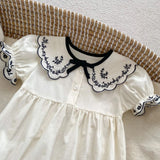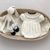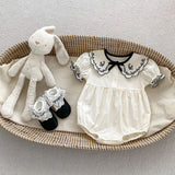 Introducing the Harper Embroidered Romper - perfect for your little one's summer wardrobe. Made with soft cotton and featuring delicate embroidered details on the collar and sleeves, this romper is both stylish and comfortable. The bow appliqué adds a charming touch, while the front buttons and diaper snaps make for easy dressing and changes.