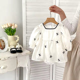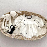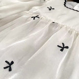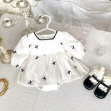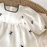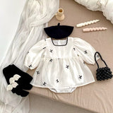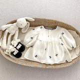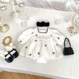 The Holiday Collection - Bow Dress features a long sleeve design and an elegant organza overlay, perfect for special occasions. Adorned with delicate bow embroidery, this dress exudes sophistication. Convenient snaps at the diaper make changing a breeze. Elevate your little one's style with this stunning dress.