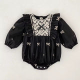 Dress your little one in holiday charm with this adorable cotton bow romper. Featuring a sweet front bow applique and cozy long sleeves, it's the perfect blend of style and comfort for festive celebrations. The soft, breathable cotton fabric keeps baby girl comfortable all day long, while the charming bow detail adds that special touch every parent loves.