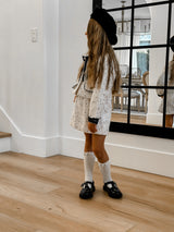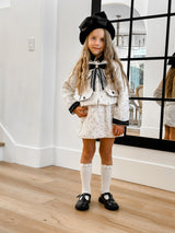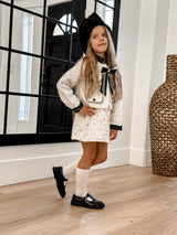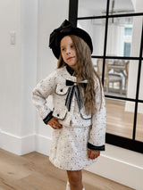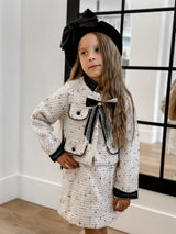 This Classy Tweed Set offers a sophisticated and chic look with its tweed jacket, accented by pearl buttons  and satin bow. The pocket applique adds a touch of elegance, while the matching skirt completes the ensemble. Elevate your style this season with this timeless set.