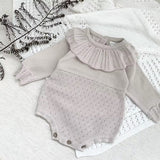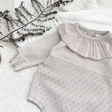 This long sleeve romper features a detailed collar and a unique hollow out pattern, perfect for your little one's wardrobe. Crafted with soft, comfortable knit fabric, this baby romper is a must-have for their daily adventures. Stay stylish and cozy with this charming and practical piece.